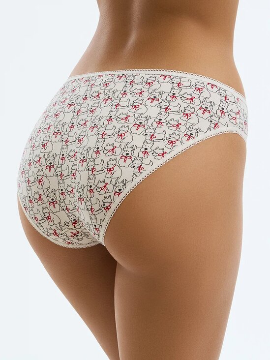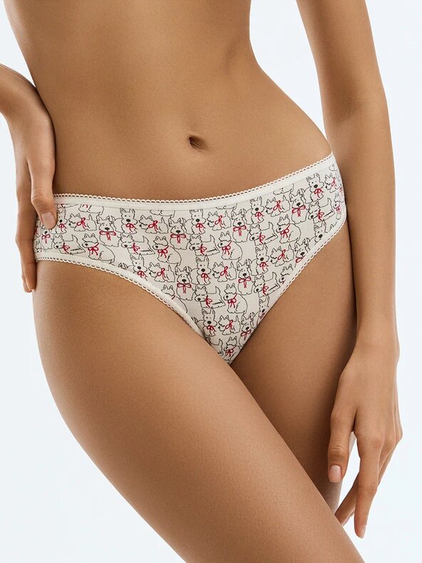 Трусы - слипы со средней линией талии и узкой боковиной. Практически полностью закрывают ягодицы. Выполнены из высокогигиеничного хлопка, который отлично пропускает воздух, впитывает влагу, не подвержен деформации и пилингу, приятно прилегает к телу и подходит даже для самой чувствительной кожи. Края обработаны мягкими эластиками с кружевными фестонами. Удобные повседневные слипы с контрастным рисунком.