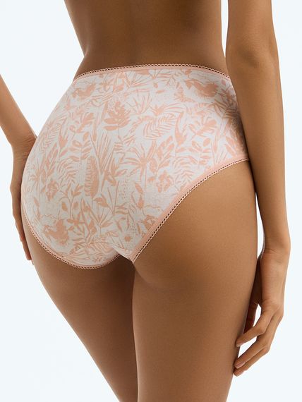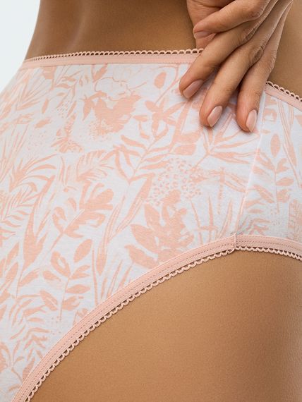 Трусы - слипы со средней линией талии с широкой боковиной. Практически полностью закрывают ягодицы. Изготовлены из высокогигиеничного хлопка, который не подвержен деформации и пилингу, отлично пропускает воздух, впитывает влагу и подходит даже для самой чувствительной кожи. Края, обработанные мягкими эластиками с кружевными фестонами, создают дополнительный комфорт.