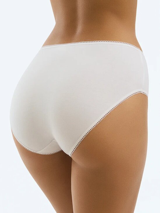 Трусы - слипы со средней линией талии с широкой боковиной. Практически полностью закрывают ягодицы. Изготовлены из высокогигиеничного хлопка, который не подвержен деформации и пилингу, отлично пропускает воздух, впитывает влагу и подходит даже для самой чувствительной кожи. Края, обработанные мягкими эластиками с кружевными фестонами, создают дополнительный комфорт.