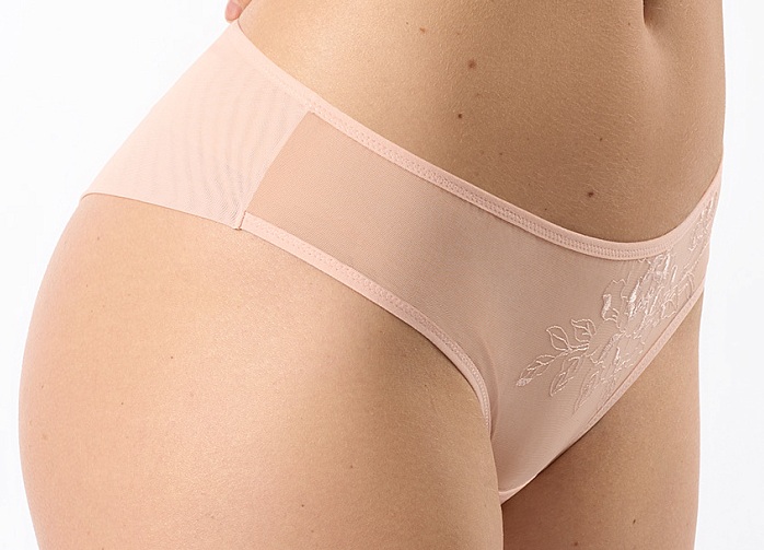 Трусы «бразилиана» из сетки со средней линией талии. С изящной цветочной вышивкой и контрастной отделкой по краям. Эффектно подчеркивают бедра, придают им округлую форму и делают фигуру более соблазнительной. Ластовица из мягкого хлопка обеспечивает дополнительный комфорт.