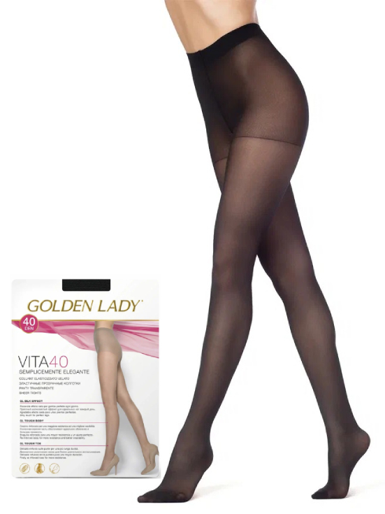 Колготки женские GOLDEN LADY VITA 40 den - эластичные колготки с шелковистым эффектом. Усиленная верхняя часть в виде шортиков обеспечивает идеальное облегание и большую прочность, укрепленный мысок повышает износостойкость. Удобные швы создают дополнительный комфорт. Классические женские колготки GOLDEN LADY VITA станут идеальным дополнением повседневного гардероба. Они отлично сочетаются с деловым, городским или вечерним образом. Приятная шелковистая текстура колготок придает ногам ухоженный вид и подчеркивает их красоту и изящество.