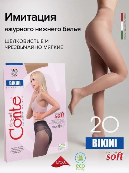 Прозрачные колготки Conte elegant BIKINI 20 den с легким блеском и имитацией ажурного нижнего белья связаны из инновационных нитей с улучшенными тактильными свойствами. Шелковистые и чрезвычайно мягкие, колготки BIKINI 20 den идеально подходят для чувствительной кожи. Особенности модели: имитация ажурных трусиков; хлопковая ластовица; уплотненный мысок; улучшенные тактильные свойства; шелковистые и мягкие; подходят для обладательниц чувствительной кожи. Интернет-магазин Kypioptom.ru предлагает купить колготки Конте Бикини 20 ден оптом и в розницу по выгодным ценам.