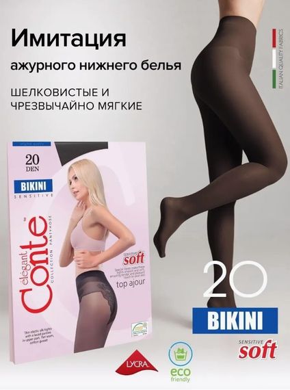 Прозрачные колготки Conte elegant BIKINI 20 den с легким блеском и имитацией ажурного нижнего белья связаны из инновационных нитей с улучшенными тактильными свойствами. Шелковистые и чрезвычайно мягкие, колготки BIKINI 20 den идеально подходят для чувствительной кожи. Особенности модели: имитация ажурных трусиков; хлопковая ластовица; уплотненный мысок; улучшенные тактильные свойства; шелковистые и мягкие; подходят для обладательниц чувствительной кожи. Интернет-магазин Kypioptom.ru предлагает купить колготки Конте Бикини 20 ден оптом и в розницу по выгодным ценам.