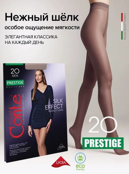 Прозрачные эластичные колготки Conte PRESTIGE 20 den с эффектом «нежный шелк» создают особое ощущение мягкости. Колготки связаны из мультифиламентных нитей, благодаря строению которых полотно получается ультрапрочным, гладким, с легким глянцевым блеском.Ненавязчивое, благородное сияние полотна делает ноги безупречно гладкими и стройными. Особенности модели: мультифиламентные нити с эффектом «нежный шелк»; хлопковая ластовица в размерах 2-4; большая вставка в размере 5; уплотненный мысок; плоский шов; колготки без шортиков; идеальное облегание с ощущением «второй кожи»; элегантная классика на каждый день. Интернет-магазин Kypioptom.ru предлагает купить корректирующие колготки Конте ПРЕСТИЖ 20 ден оптом и в розницу по выгодным ценам.