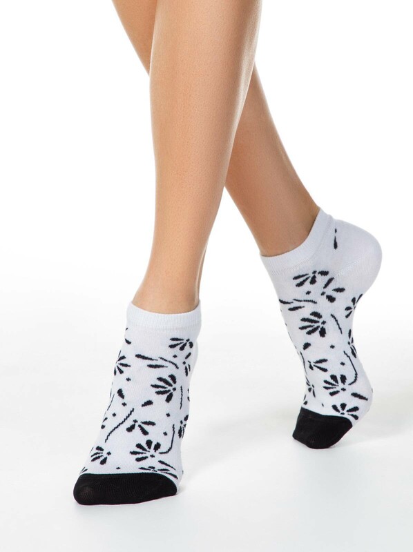 Носки украшены цветочным принтом. Двойная резиночка очень мягкая, поэтому абсолютно не ощущается при движениях. Отличается увеличенной устойчивостью к износу и эластичностью. Натуральный материал с приятной текстурой обладает гигроскопичными и воздухопроницаемыми свойствами.