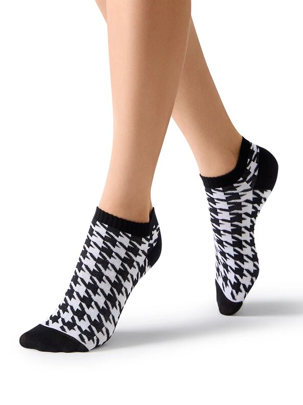 Женские укороченные носки с рисунком «гусиная лапка». Выполнены из мягкого хлопка, который отлично пропускает воздух, впитывает влагу и подходит даже для самой чувствительной кожи. Удобная резинка и кеттельный (плоский) шов на мыске обеспечивают оптимальный комфорт и превосходное облегание. Принт «гусиная лапка» - вневременной орнамент, который навсегда останется актуальной модной классикой. Он стильный, лаконичный и эффектно дополняет самые разные образы - от спорт шика и уличного до делового или повседневного.