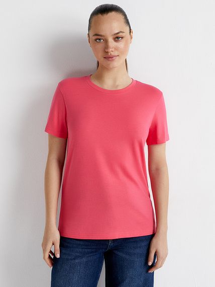 Женская футболка с коротким рукавом. В составе – высококачественный хлопок, который обладает отличной воздухопроницаемостью, хорошо впитывает влагу и подходит даже для чувствительной кожи, и эластан, который позволяет создать полуприлегающий силуэт и способствует длительному сохранению формы и цвета. Удобная, легкая и стильная. Благодаря прямому крою и свободному силуэту эффектно смотрится независимо от типа фигуры, обеспечивает свободу движений, и подходит как для занятий спортом, так и на каждый день.