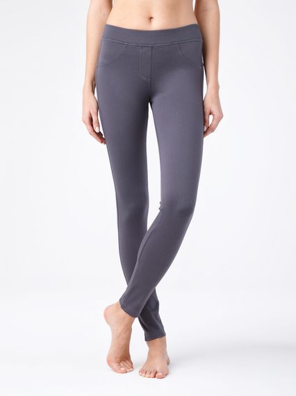 Легинсы женские облегающие из трикотажного полотна "джинс". По переду изделия - имитация гульфика и боковых карманов. По спинке - фигурные кокетки и накладные карманы. Верх изделия обработан поясом с широкой резинкой внутри. По концам накладных карманов и