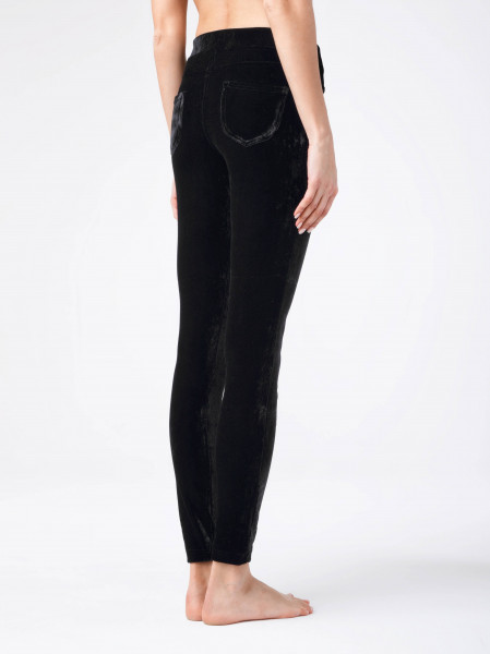 Леггинсы женские облегающие c боковыми швами. по переду изделия - имитация гульфика и боковых карманов. по задней части леггинсов - кокетки и накладные карманы. боковые швы, гульфик, имитация боковых карманов переда, накладные карманы, кокетки задней части и шов сидения с двумя рядами отделочных строчек. верх изделия обработан широким поясом с широкой резинкой внутри. шов притачивания пояса с отделочной строчкой.