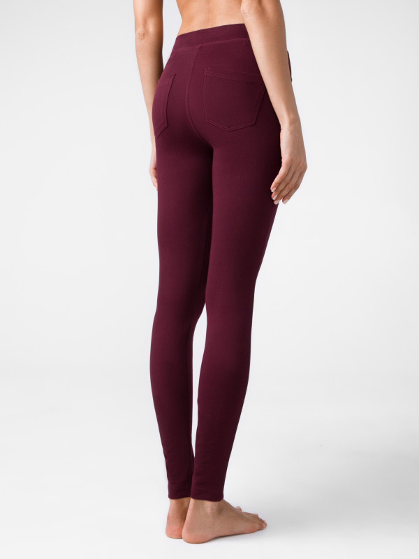 Легинсы женские из эластичного трикотажного полотна. По переду имитация гульфика и боковых карманов, по спинке настрочены накладные карманы. Верх изделия обработан притачным поясом с эластичной тесьмой внутри.