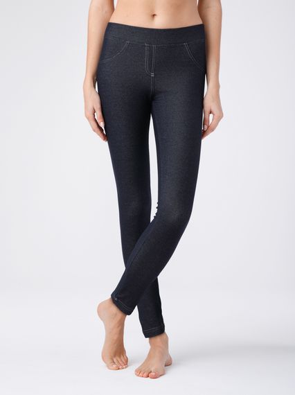 Легинсы женские из трикотажного полотна с подчесом. Без боковых швов, с фигурной кокеткой. По переду имитация гульфика. По задним половинкам два накладных кармана с двумя хольнетенами по концам. Пояс притачной с широкой эластичной тесьмой внутри. По швам