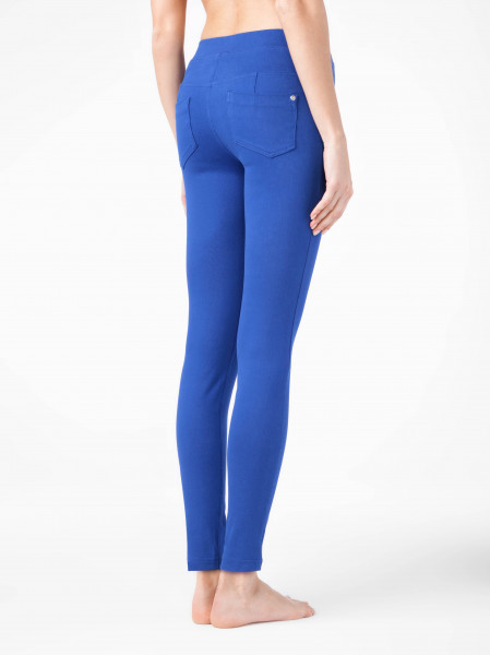 Легинсы женские облегающие из однотонного трикотажного полотна. По переду имитация гульфика и боковых карманов. В карманы вставлен декоративный кант. По спинке кокетка. Накладные карманы по спинке с вышивкой "якорь" и хольнитенами контрастного цвета. Верх