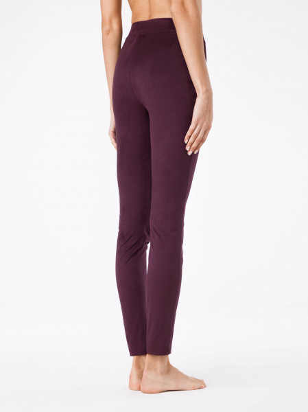 Легинсы женские из однотонного трикотажного полотна "замша". Верх изделия обработан притачным поясом с эластичной тесьмой внутри.