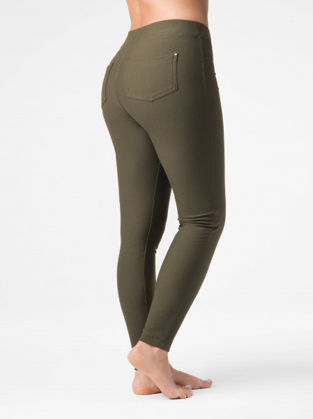 Легинсы женские из однотонного трикотажного полотна . По переду имитация боковых карманов и гульфика, по задним половинкам два накладных кармана с хольнитенами по краям. Верх изделия обработан притачным поясом с эластичной тесьмой внутри.