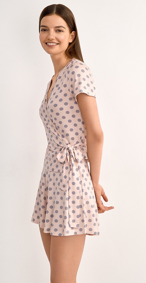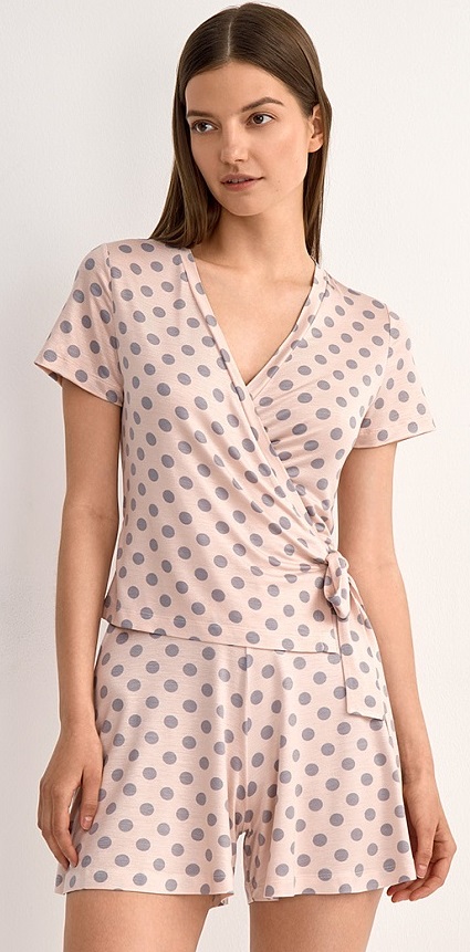Женская домашняя пижама: полуприлегающая блузка с запахом и коротким рукавом и расклешенные шорты на резинке. Горловина и край борта обработаны обтачкой. Рукав втачной, короткий. Изготовлен из вискозы, которая отлично пропускает воздух, впитывает влагу, обладает теплообменными свойствами и потрясающе ощущается на теле благодаря шелковистой текстуре. Материал не электризуется и хорошо сохраняет насыщенность цвета. Добавление эластана позволяет создать изящный полуприлегающий силуэт. Деликатная обработка горловины и края борта обеспечивает дополнительный комфорт.