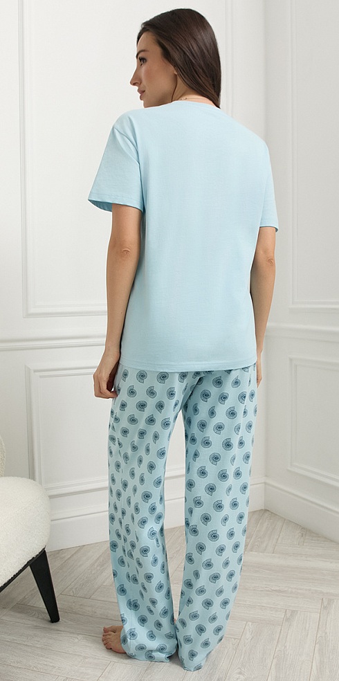 Женская пижама с трендовым принтом: классическая футболка с коротким рукавом и круглым вырезом, а также прямые брюки с карманами и поясом на резинке. Изготовлена из 100% мягкого, вгребенного хлопка, который отлично пропускает воздух, приятно ощущается на теле и подходит даже для самой чувствительной кожи.Пижаму можно носить как единым комплектом, так и сочетать с другими вещами. Идеально подходит для сна и отдыха. Акцентный принт добавляет образу модное звучание и превращает домашний комплект в стильный элемент гардероба.