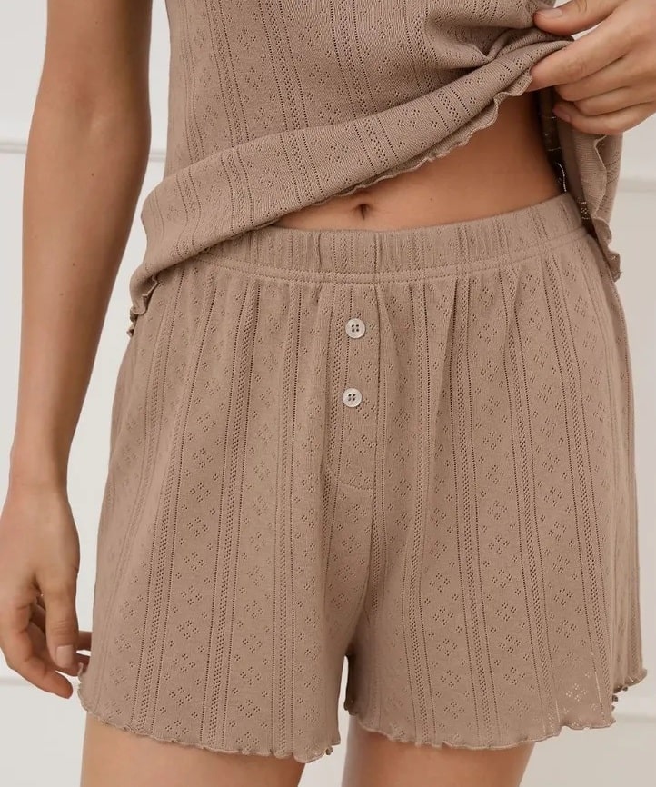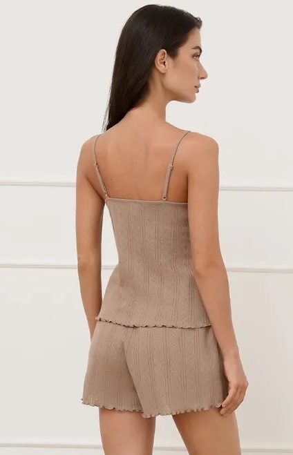 Женская пижама из ажурного трикотажа пуантель: топ на тонких регулируемых бретелях с деликатной обработкой края и укороченные шорты без карманов и декоративным гульфиком на пуговицах. Изготовлена из лёгкого и мягкого высококачественного хлопка, который превосходно пропускает воздух, приятно ощущается на теле и подходит даже для чувствительной кожи. Трикотаж пуантель подчёркивает нежность образа и дарит особый комфорт благодаря эластичности материала и нежной текстуре.