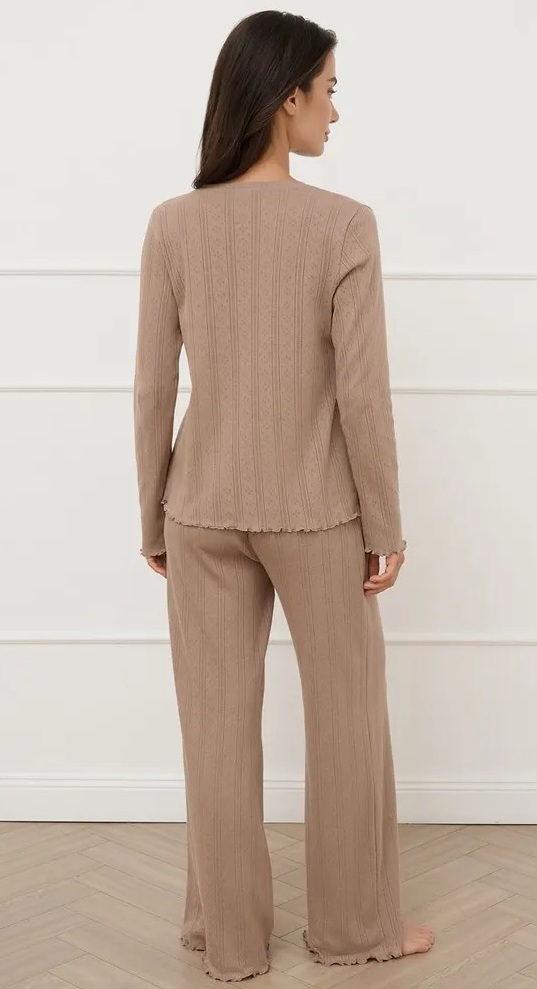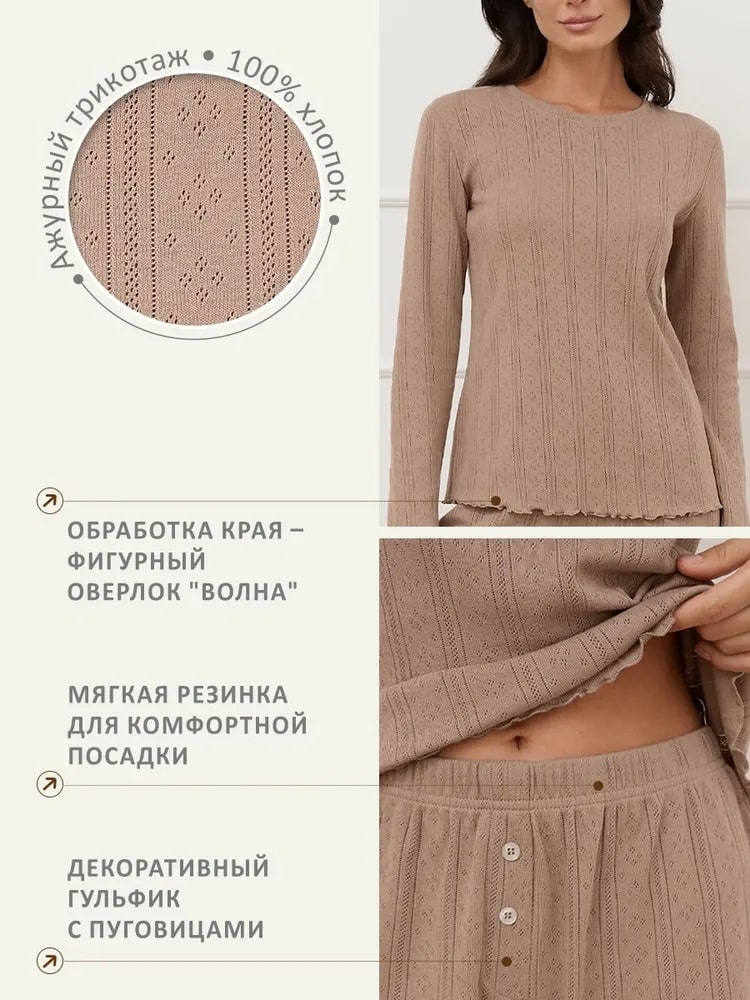 Женский домашний комплект из ажурного трикотажа пуантель: полуприлегающий лонгслив с длинным рукавом и широкие свободные брюки с декоративным гульфиком. Изготовлен из лёгкого и мягкого высококачественного хлопка, который превосходно пропускает воздух, приятно ощущается на теле и подходит даже для нежной и чувствительной кожи. Трикотаж пуантель дарит особый комфорт благодаря эластичности материала и деликатной текстуре. Комплект воплощает эстетику непринуждённой элегантности и утончённой женственности, которая сегодня на пике модных тенденций. Ажурный орнамент пуантель придаёт образу визуальную лёгкость и делает домашний стиль изысканным и актуальным.